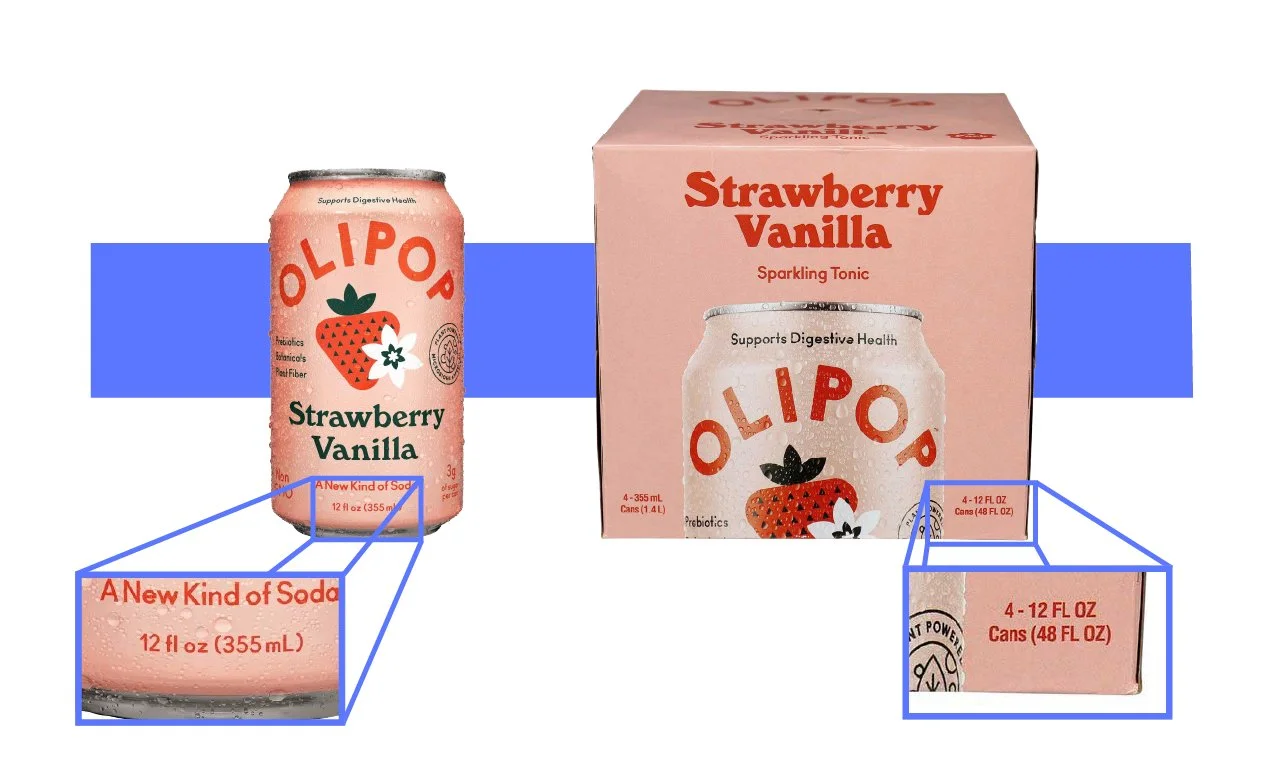 Multi-packs require a primary declaration including the quantity of individual units and the weight or volume of each unit, plus the total volume in parenthesis. For example, a 4-pack of 12 fl oz bottles should be written as “4-12 fl oz bottles (48 fl oz)”. You can optionally include a metric declaration by weight (solids) or volume (liquids).
