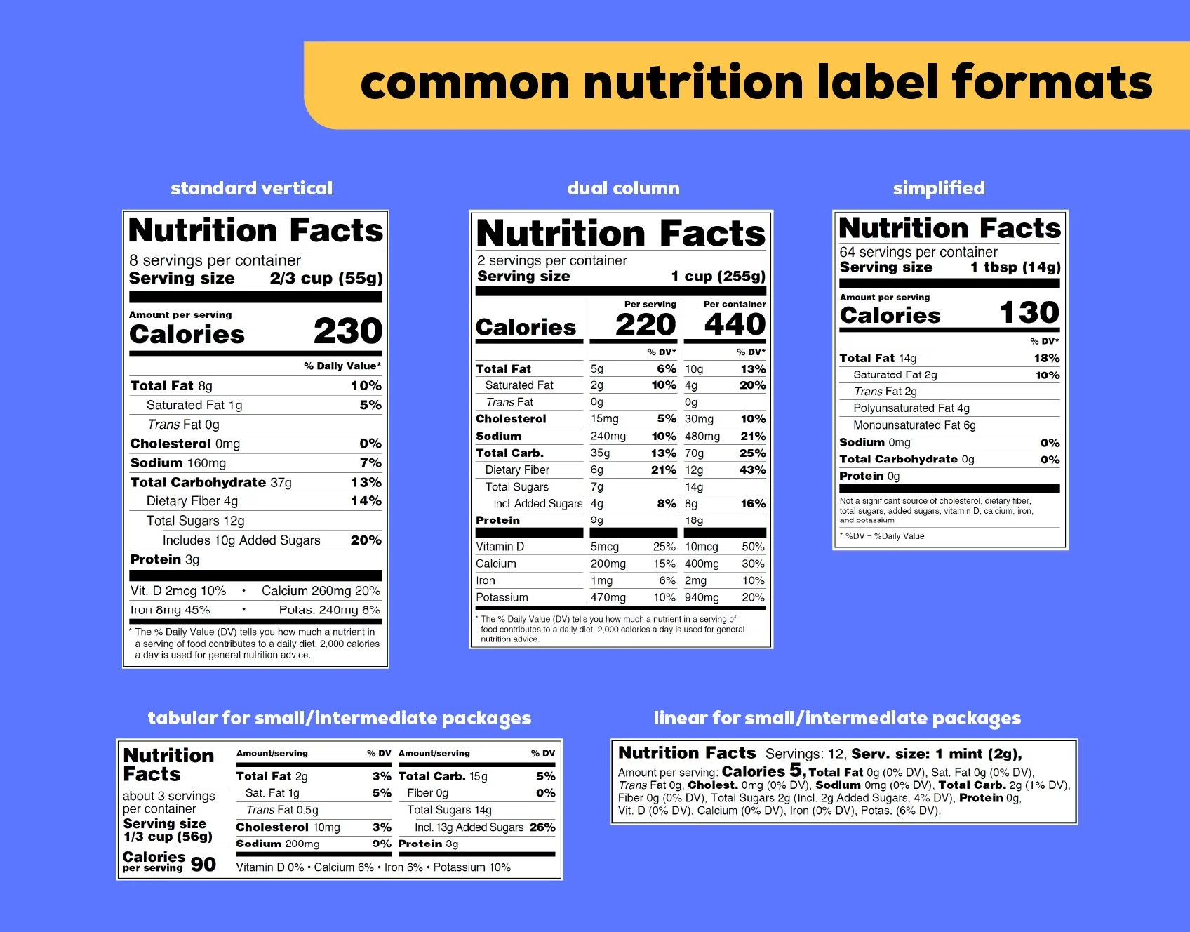 Note that there are a few different nutrition fact display formats. The format you can use is guided by the type and size of packaging you are working with. The vertical format is the preferred format except in a few specific instances: